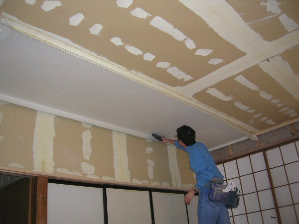 リビングルーム天井の壁紙クロスを、アトピッコハウスの呼吸する織物壁紙“すっぴんクロス”の施工